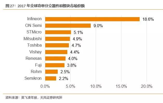 In 2017, the global market for power discrete devices and modules totaled $18.6 billion. Among them, Infineon ranked first with 18.6% market share. The second is ON Semiconductor and the third is STMicroelectronics.