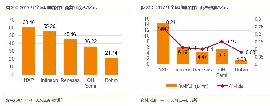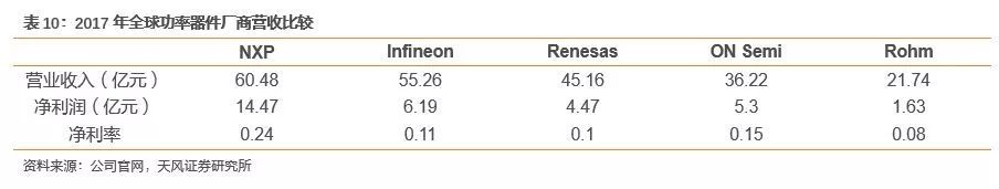 NXP’s revenues ranked first in the global power device market in 2017. Operating income was 6.548 billion yuan, net profit was 1.447 billion yuan, and net profit margin was 0.24. Infineon ranked second, with operating income of 5.526 billion yuan, net profit of 619 million yuan, and a net profit margin of 0.11.