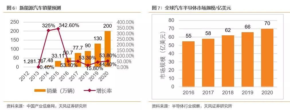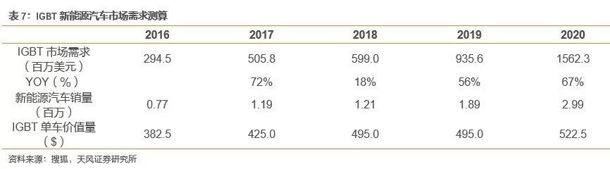 IGBT is the core component of the new energy vehicle motor control system. The three-phase asynchronous motor drive used in the Tesla Model S model requires 28 IGBT chips for each phase and 84 IGBT chips for the three phases. The price of each is about 4 to 5 dollars. We expect the IGBT’s bicycle value to be around $420. According to the global sales of new energy vehicles, the IGBT market demand brought by new energy vehicles can be derived.
