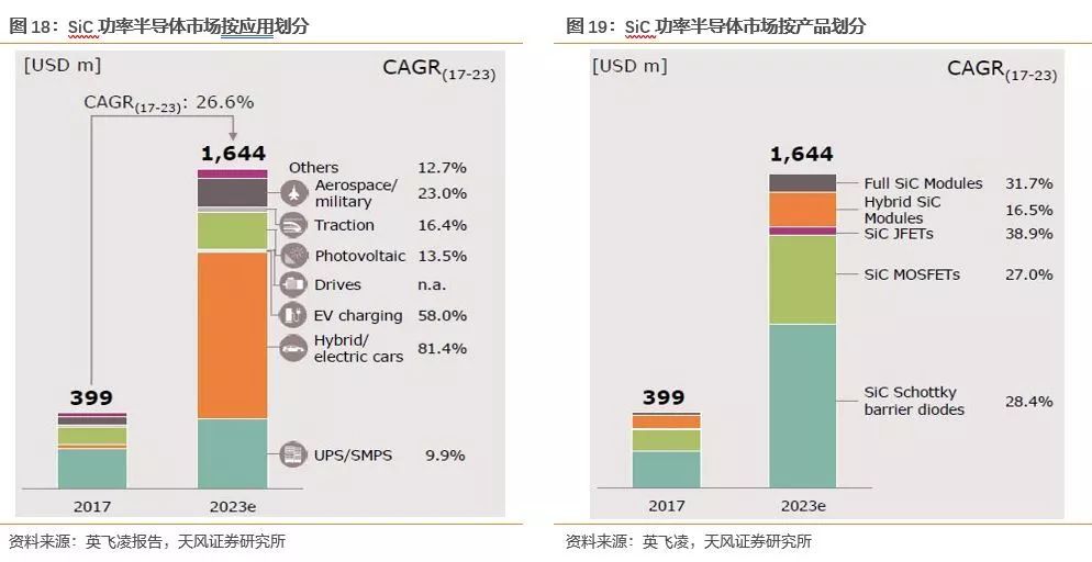 In 2017, the global SiC power semiconductor market totaled 399 million US dollars. It is estimated that by 2023, the total market will reach 1.644 billion US dollars, with a compound annual growth rate of 26.6%. From the application point of view, the growth rate of hybrid and pure electric vehicles is the highest, reaching 81.4%. In terms of products, SiC JFETs have the highest growth rate of 38.9%. Followed by the full SiC power module, the growth rate reached 31.7%.