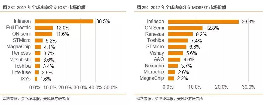 In 2017, the global power discrete IGBT market totaled $1.1 billion. Among them, Infineon ranked first with 38.5% market share, and second with Fuji Electric. In 2017, the global power discrete MOSFET market totaled $6.65 billion. Among them, Infineon ranked first with a market share of 26.3%. The second is ON Semiconductor.