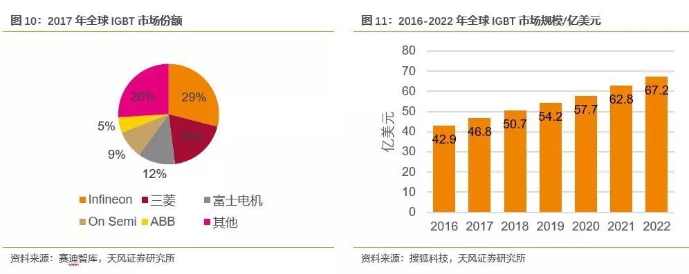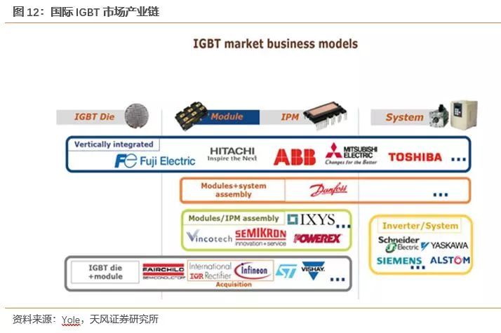 The main competitors in the global IGBT market include Infineon of Germany, Mitsubishi of Japan, Fuji Electric, American Anson, and Swiss ABB. The top five companies have a market share of over 70%. We expect the global IGBT market to reach US$6 billion in 2022, with huge incremental space. Foreign manufacturers have developed a complete range of IGBT products. Among them, Xiantong and other enterprises are in a dominant position in the consumer IGBT field. ABB, Infineon and Mitsubishi Electric have an advantage in the industrial grade IGBT field above 1700V. In the field of voltage levels above 3300V, Infineon, ABB and Mitsubishi Electric have a monopoly position, representing the highest level of international IGBT technology.