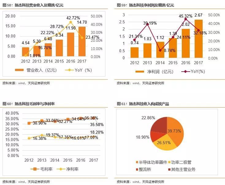 According to the company’s 2017 financial report, the company’s fiscal year 2017 revenue of 1.47 billion yuan, an increase of 23.47%, net profit of 267 million yuan, an increase of 32.18%. Yang Jie controls costs through the IDM model, and the profit indicators lead the market. In 2017, the company’s gross profit margin reached 35.58%, and the net profit margin was 18.20%. Among the company’s revenue structure, power semiconductor devices contributed the main income, accounting for 39.73%.