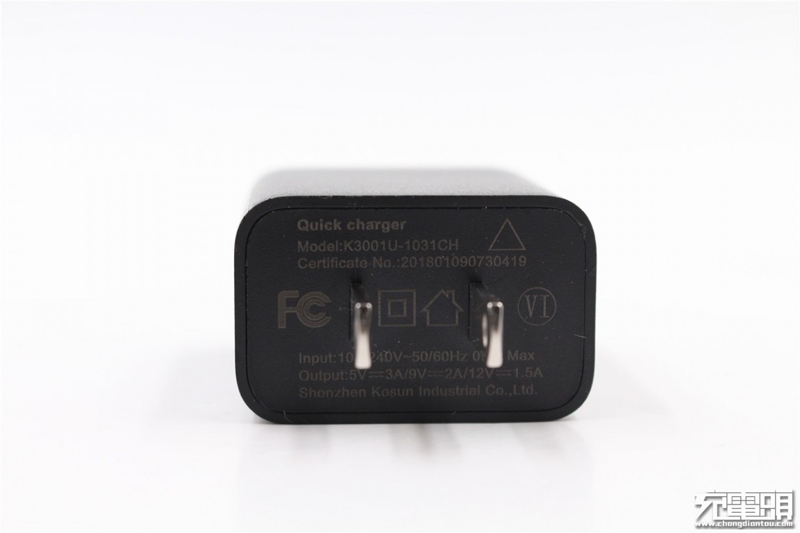 The input end is printed with the product parameters: Quick Charger, model: K3001U-1031CH, certificate number: 201801090730419, the charger has passed the FCC, and level 6 energy efficiency certification. Input support 100-240V 50/60Hz 0.5A; output support 5V/3A, 9V/2A, 12V/1.5A, manufacturer: Shenzhen Kexun Industrial Co., Ltd.