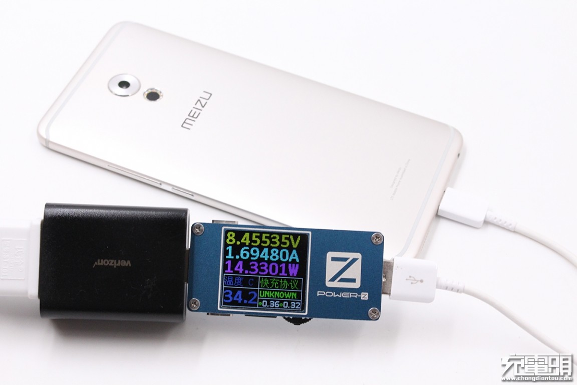 Charging Meizu Pro 6 Plus, voltage 8.45V, current 1.69A, charging power 14.33W, support MTK PE fast charge.