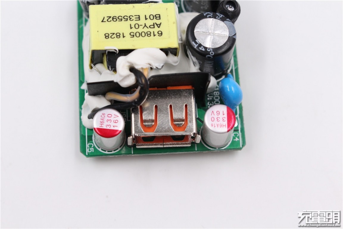 There are two solid capacitors next to the USB-A output interface, size 16V 330uF, for output filtering.
