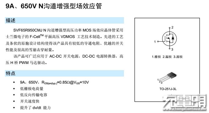 The primary switch is the Silan Micro 65R950. Silan Micro SVF65R950CMJ/Q/D channel enhanced high voltage power MOS field effect transistor is fabricated by F-Cell planar high voltage VDMOS process technology. The advanced process and strip cell design make the product have low on-resistance, superior switching performance and high avalanche breakdown resistance. This product can be widely used in AC-DC switching power supply, DC-DC power converter, high voltage H-bridge PWM motor drive.